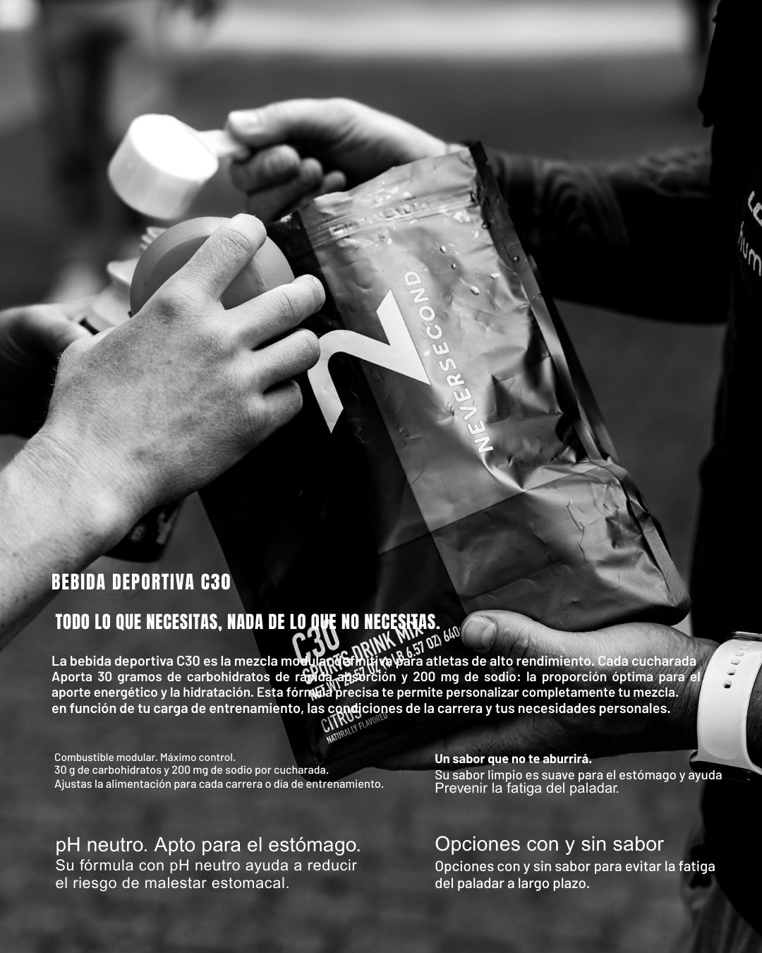 El C30 Mix utiliza la fórmula probada de Neversecond 2:1 (Maltodextrina a Fructosa). Esta proporción está diseñada para maximizar el transporte y la absorción de carbohidratos, asegurando que obtienes el máximo provecho de cada sorbo.